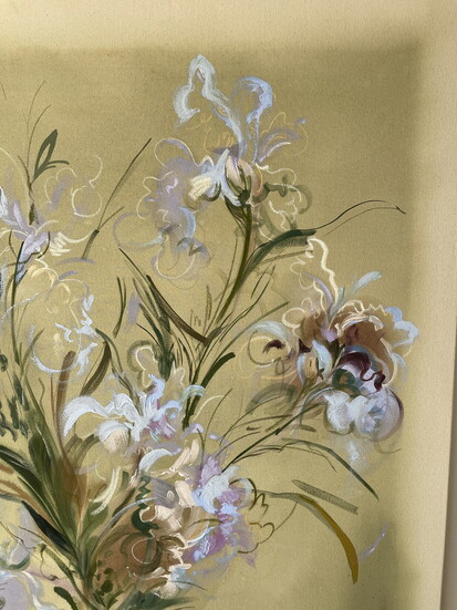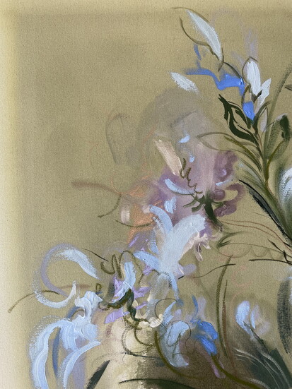 These influences converge in her interpretation of the local environment, allowing her to express the terrain, flora and changing light of the region in a distinctly contemporary visual language. Her recent iris-focused series, developed from flowers grown in her own garden, reflects her ongoing exploration of intimate botanical forms and seasonal light.