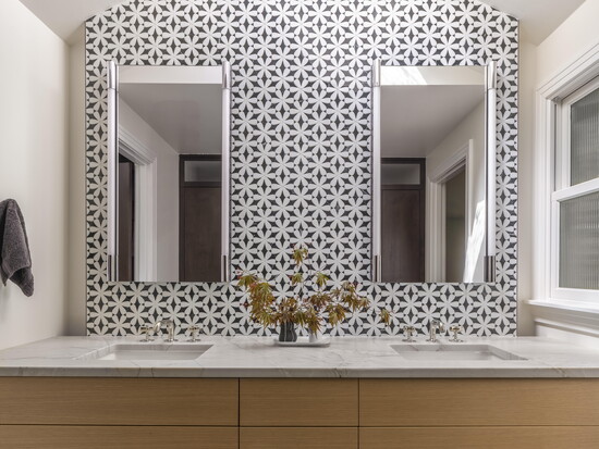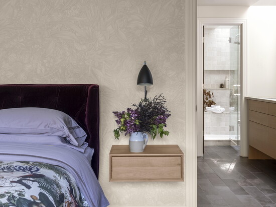 In the dining room, a bold forest-inspired wallpaper sets a dramatic stage for entertaining, becoming both a conversation starter and a backdrop that makes gatherings feel vibrant and memorable. In the primary suite, jungle botanical motifs shift the mood, creating a more intimate, restorative retreat — a reminder of the natural world even in the home’s most private spaces.