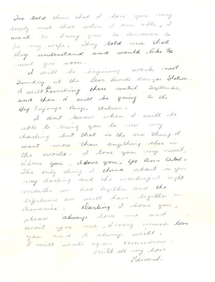 I don’t know when I will be able to bring you to me, my darling, but that is the one thing I want more than anything else in the world. I love you my sweet. I love you, I adore you, you are wanted. The only thing I think about is you my darling and the wonderful nine months we had together and the lifetime we will have together in America. Darling I love you, please always love me and wait for me. I very much love you and I always will.