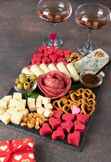 Ingredients like fresh fruits, tangy spreads, and salty nuts add variety to your board. Fruits like strawberries and raspberries fit nicely on a board, and their rich red hue fits the Valentine's theme. Nuts like almonds and pistachios add a salty crunch.