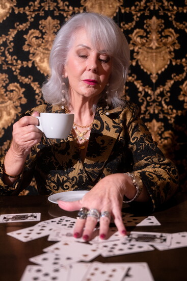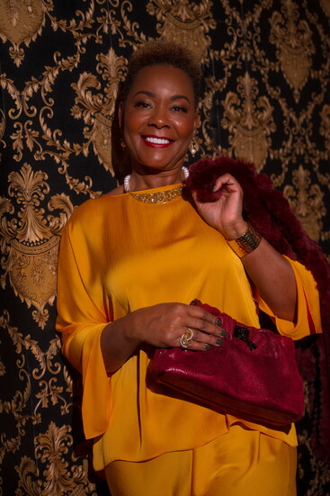Linda: Gold and black brocade coat dress @shopsilhouette; Valentina Pearl Drop Earrings $66.00 @serendipityhouseofstyle; French Kande Angélique Triple Strand Pearls Silver Necklace Gold $392.00 @serendipityhouseofstyle