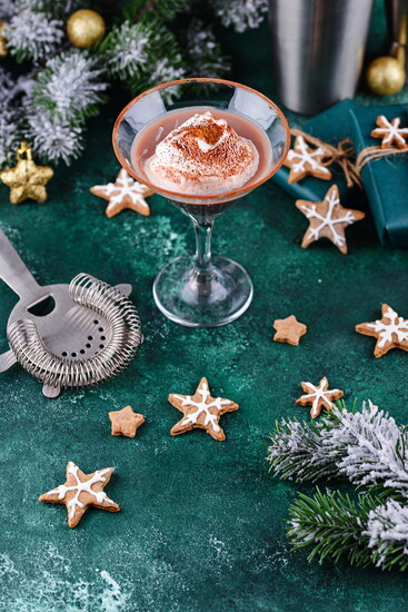 Rim glass with frosting and sprinkles. Shake all liquid ingredients with ice. Strain into your decorated glass. Optional: top with whipped cream or a dusting of nutmeg.