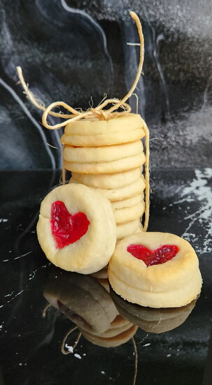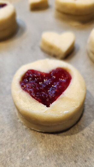 - Use flour to roll out the dough to ¼ inch thick, and cut out 2 inch circles. Using a smaller 1 inch cookie cutter, cut out circles (or hearts for your sweetie) for half of them to form the ring that will be placed on top of the jam.