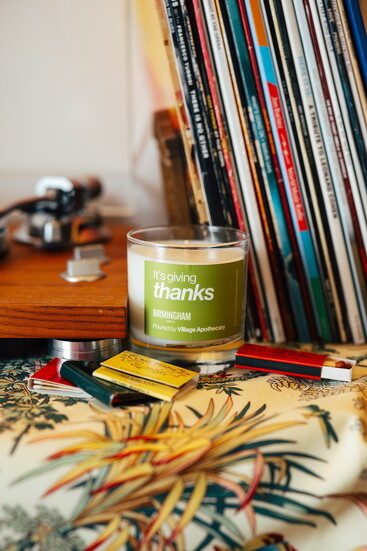 Created in collaboration with Jordan Maxey, owner of Village Apothecary, our special-edition candle, It’s Giving Thanks, lends the perfect glow and olfactory experience. Top notes of vanilla bean, almond, and coriander are grounded by soothing bottom notes of amber, tonka, and sandalwood. Base notes of warming spices, acorn, and bay leaf nod to the season.