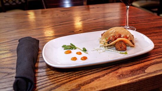 A playful third course followed—a crispy pork belly taco drizzled with peach glaze and napa slaw, paired with Sinegal Estate Cabernet Sauvignon, Sonoma Valley 2022.