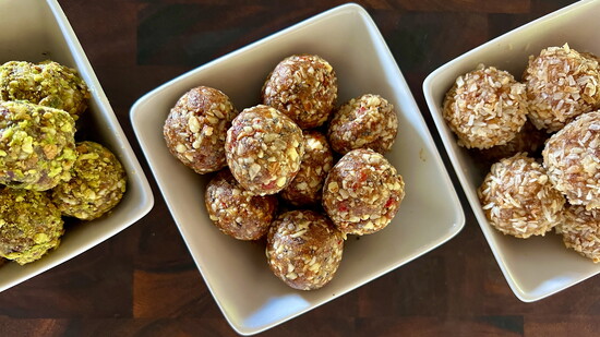 Remove pits from dates, add ingredients to a food processor, and blitz until it gets crumbly and sticky. Adjust the mix with more dates or nut butter if it is too dry, or add more nuts/seeds if it is too soft. These recipes are flexible—make them your own!