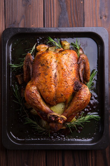Stuff for flavor: Place onion, apple, lemon, garlic and herbs inside the cavity. Tie the legs loosely with kitchen twine.