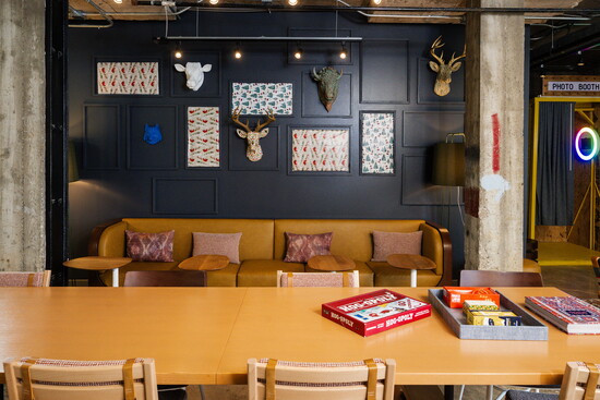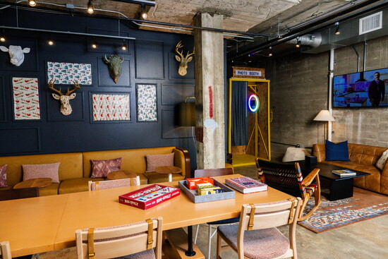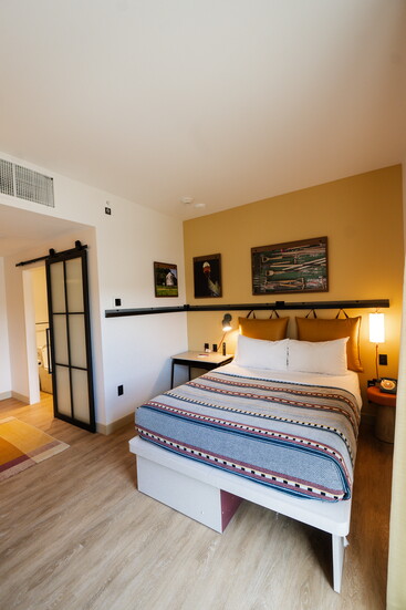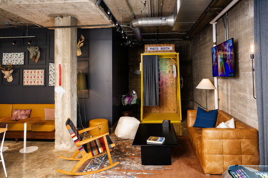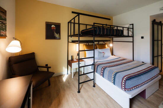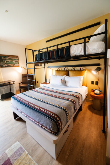 The hallmark of the Moxy is its bar – which also serves as the check-in booth for guests. Alongside their room keys, guests receive a free signature cocktail, draft beer, mocktail or coffee at check-in. By having a multi-functioning bar, the hotel further encourages connection between patrons and guests with the hopes that hotel guests will feel welcomed to spend their time in the common areas and have memorable experiences during their stay.