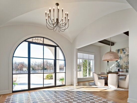 Throughout the home, custom doors and expansive window systems frame views of the surrounding landscape, flooding the interiors with light while reinforcing the home’s arched geometry and Mediterranean roots. The result is a seamless dialogue between structure and scenery, where each element feels purposeful and integrated rather than decorative.