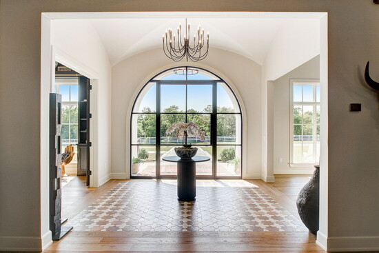 The entry is defined by a sweeping, oversized arched window unit that houses an impressive pivot door, both crafted by Monte Cristo Ironworks. Framed by soft plaster arches and patterned tile, the composition introduces a quiet strength that feels refined, timeless, and architectural. Natural light pours through the opening, while the weight and precision of the craftsmanship ground the space. Rather than competing with the architecture, these elements elevate it, setting a tone of restraint, confidence, and enduring quality.