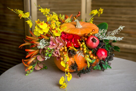 Bold, oversized florals set the tone, accented with pumpkins in fall and holiday greenery in winter. Artful and dramatic, this centerpiece captures the season’s spirit with a polished, fashion-forward edge.
