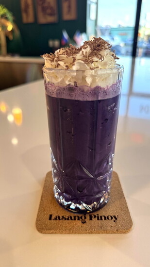 Ube syrup, made from a purple yam native to the Philippines, gives this vibrant drink its stunning color. Known for its naturally sweet, nutty flavor with subtle notes of vanilla, ube is a traditional ingredient in Filipino cuisine—often featured in desserts like ice cream and cakes, but just as delightful in inventive drinks like this one. Its natural sweetness gives the cocktail a gentle, balanced flavor, making it indulgent without being overly sugary.