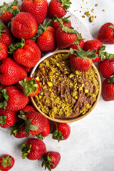 This Dubai chocolate strawberry dip mimics a Dubai chocolate bar. Velvety chocolate pudding, intensified with the addition of melted chocolate chips, is topped with a crunchy, toasted kataifi and pistachio layer, and served with whole strawberries for dipping. This is the perfect Valentine's Day treat whether you're staying in for date night, girl's night at the house, or even if you just want to sit on the couch and indulge all on your own.