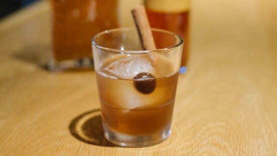 Garnish: Cinnamon Stick and Luxardo Cherry